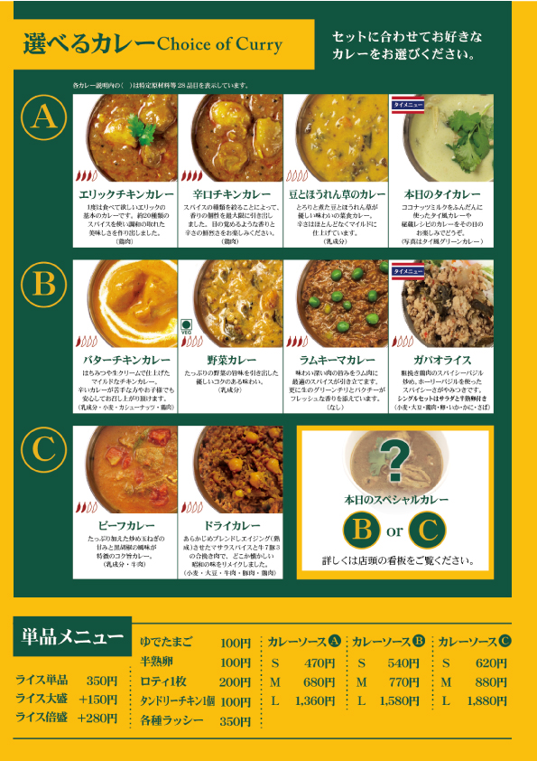 スパイシーでヘルシーな南インドカレーを中心にしつつ幅広いラインナップのカレーは、いずれも素材そのものの味わいを大切にした、毎日食べても飽きないカレーばかり。カレーの種類ごとに様々なスパイスを使い分け、毎日手作りで仕込むからこそのフレッシュで鮮烈な味わいが、オフィスやご自宅でいつでもお気軽にお楽しみいただけます。