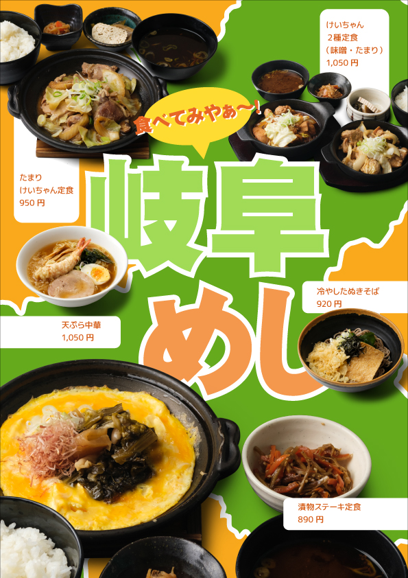 岐阜の郷土料理から和洋食まで、バラエティーに富んだいろんなメニュー。