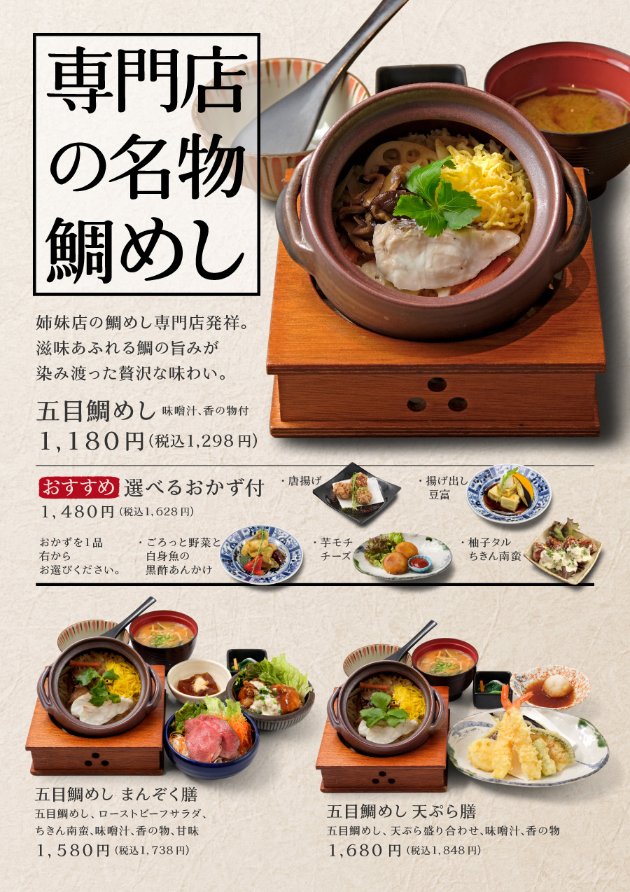 姉妹店に鯛めし専門店をもつ当店だからできる本格。土鍋炊き鯛めしは昔ながらの醤油出汁で炊いた親しみやすい味わいです。