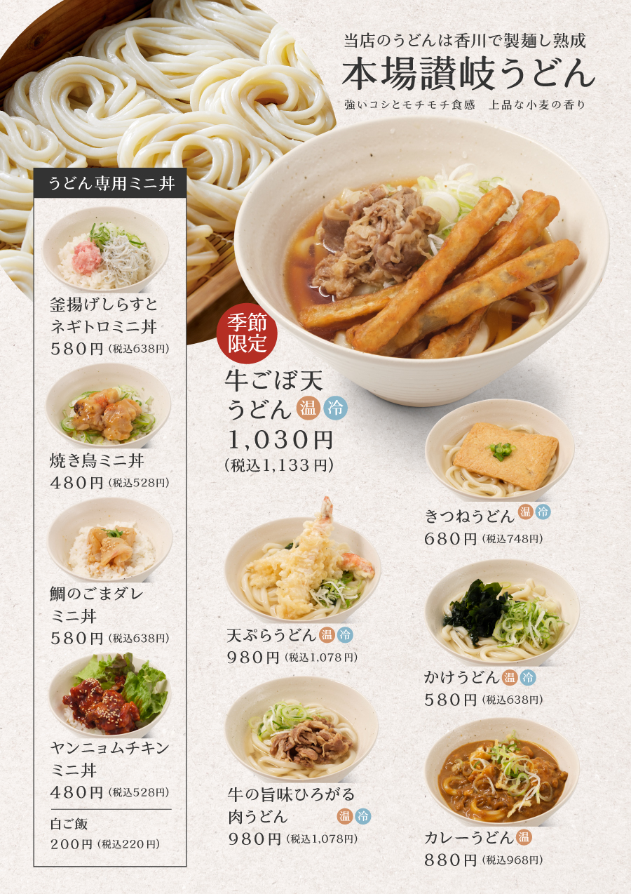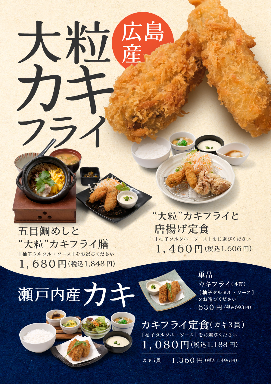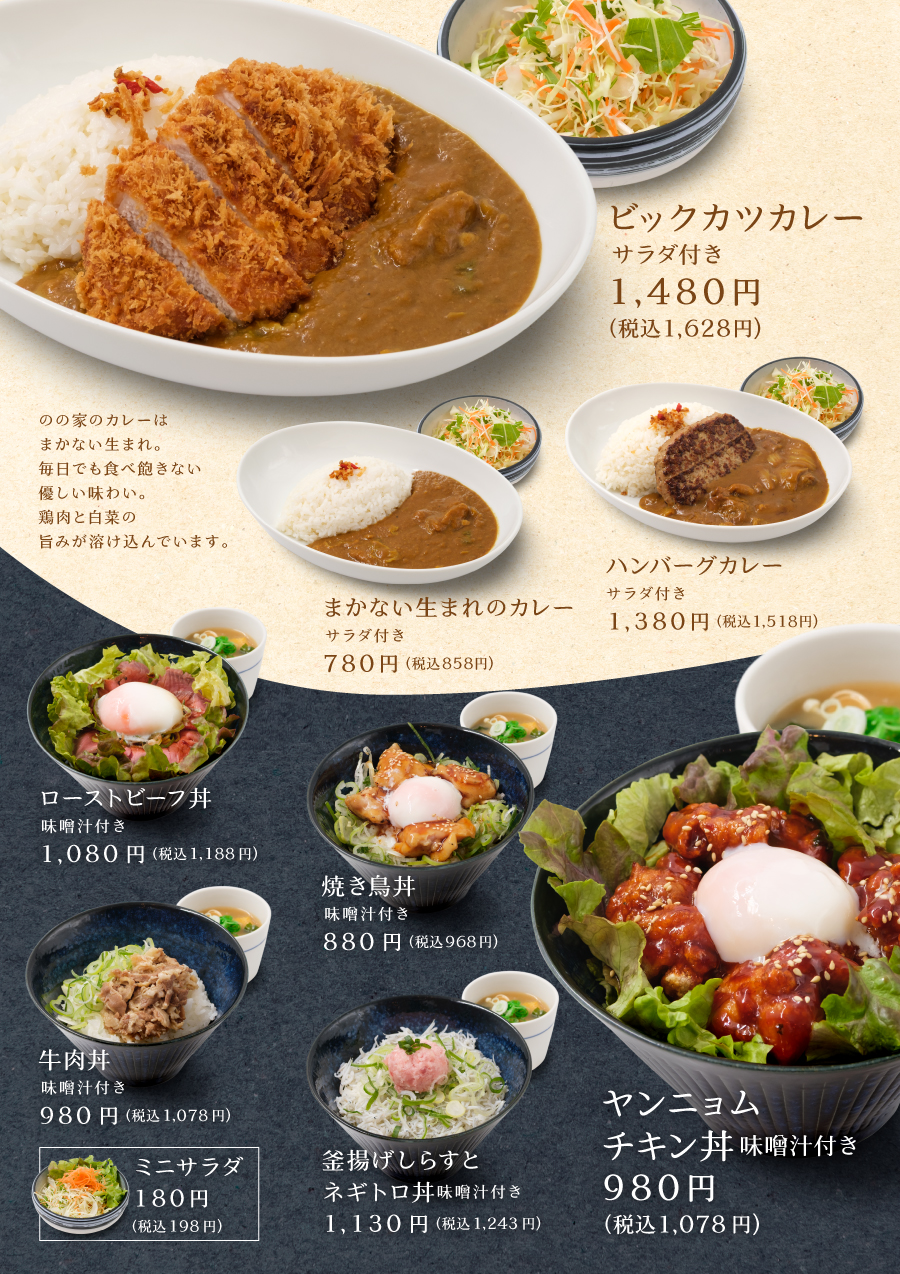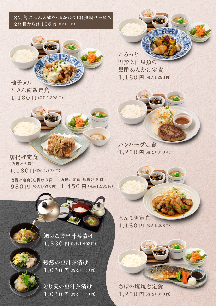 定番の定食スタイルから鯛めし、カレーライス、丼ぶり、うどんなどなど。